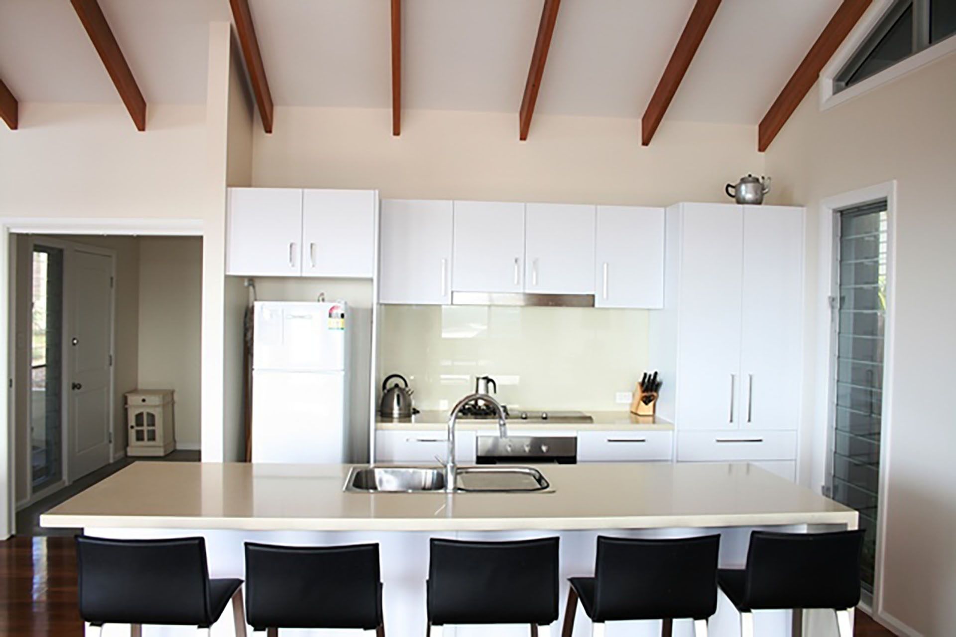 The laundry is located underneath the house in the garage area with an outdoor shower and plenty of undercover surfboard racks.