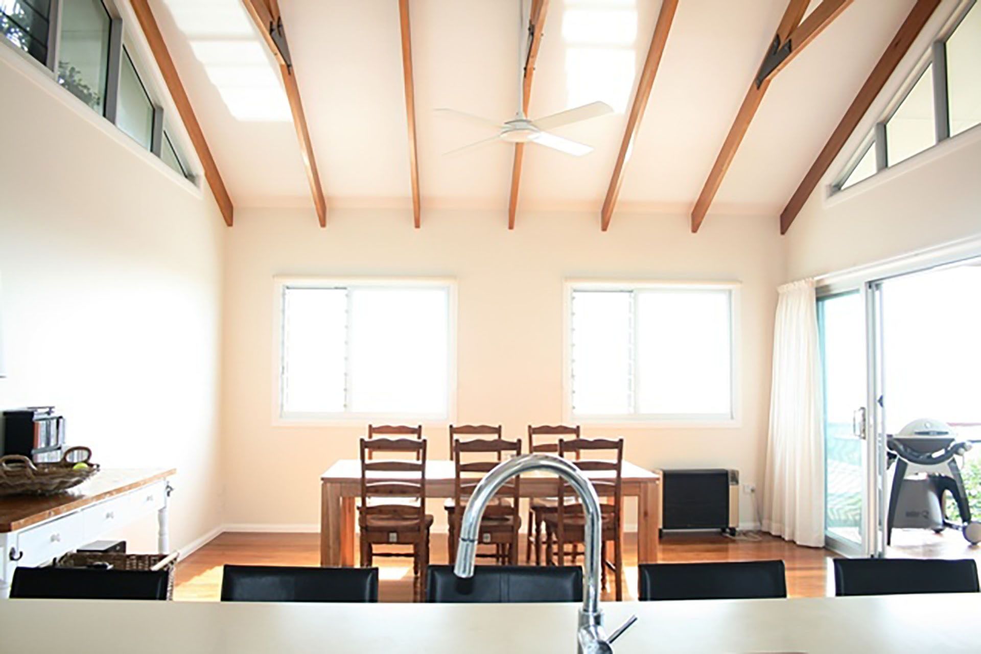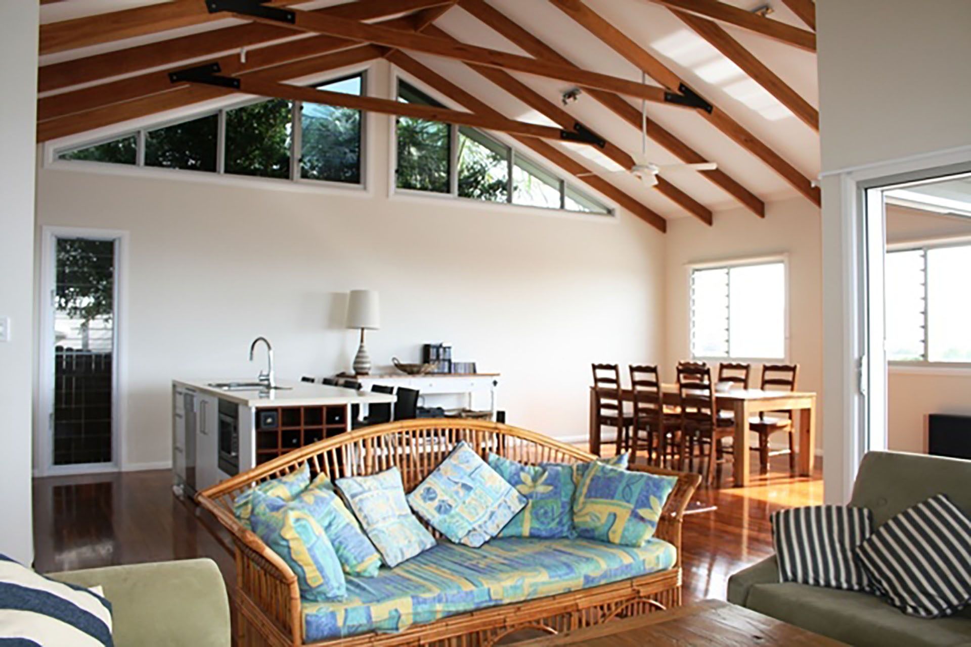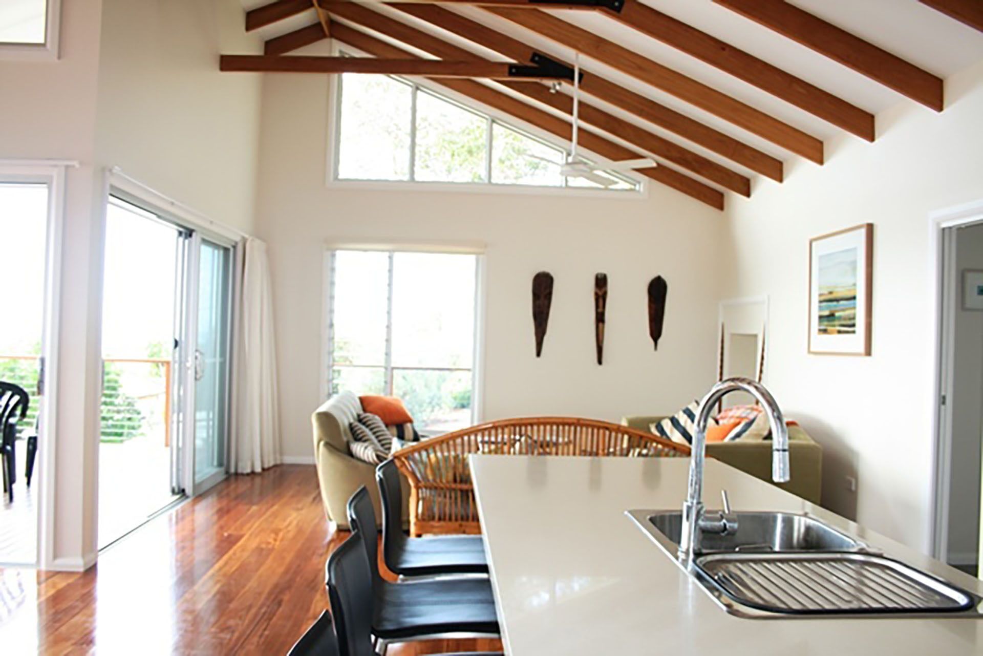 Recycled polished hardwood flooring features in this area with high cathedral ceiling. The kitchen area includes an island preparation area with granite bench tops, dishwasher, gas and induction cook top and separate wall oven. The master bedroom with ensuite, built-ins and ceiling fans with polished concrete flooring is also on this level.